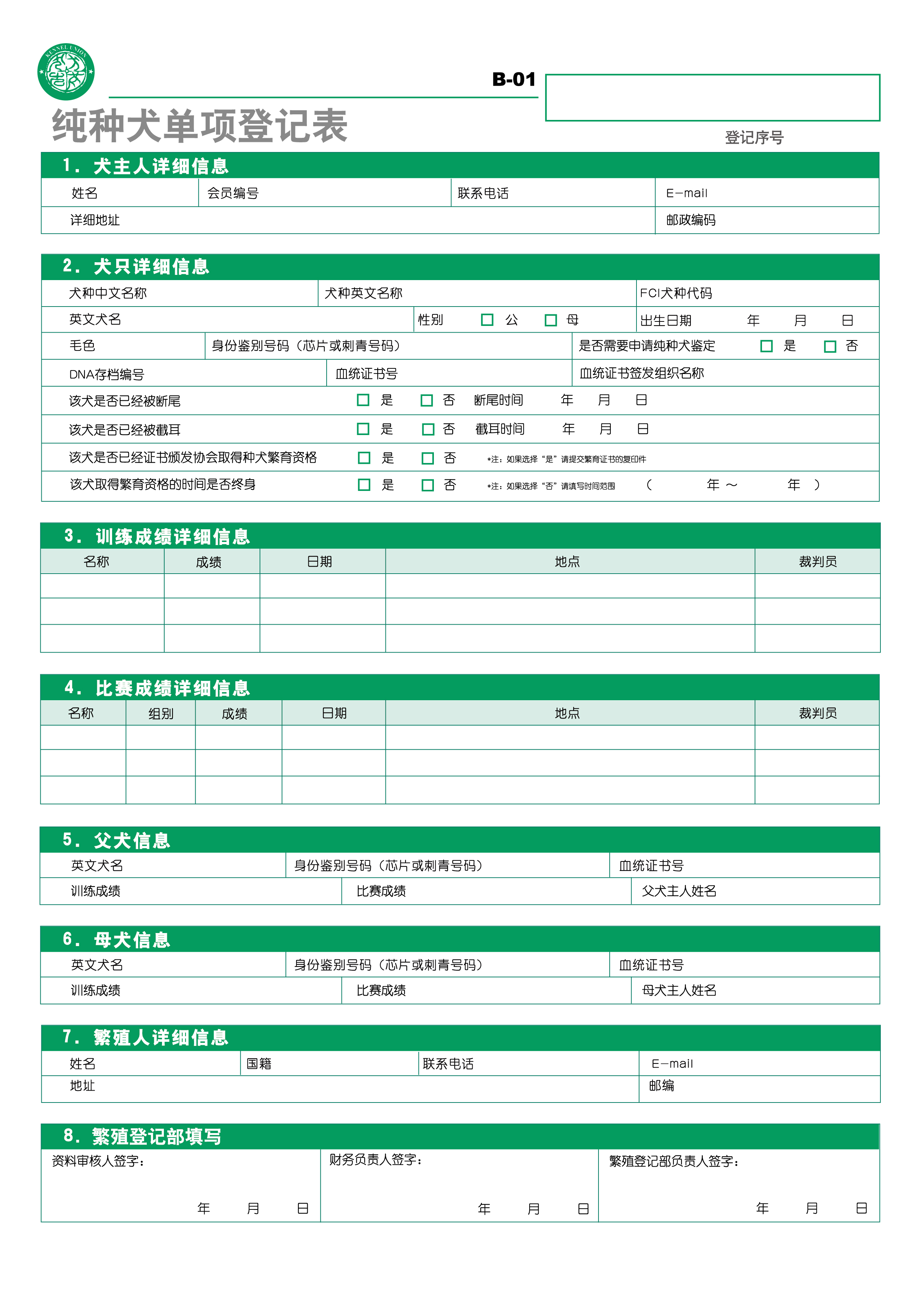 纯种犬单项登记表
